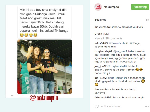 Pasalnya, Celine dan Stefan mamatok harga sendiri untuk bisa berfoto bersama mereka, yakni Rp 50 ribu. "Mau lihat harus bayar 15rb. Foto bareng mereka bayar 50rb," bunyi informasi dari si netter.