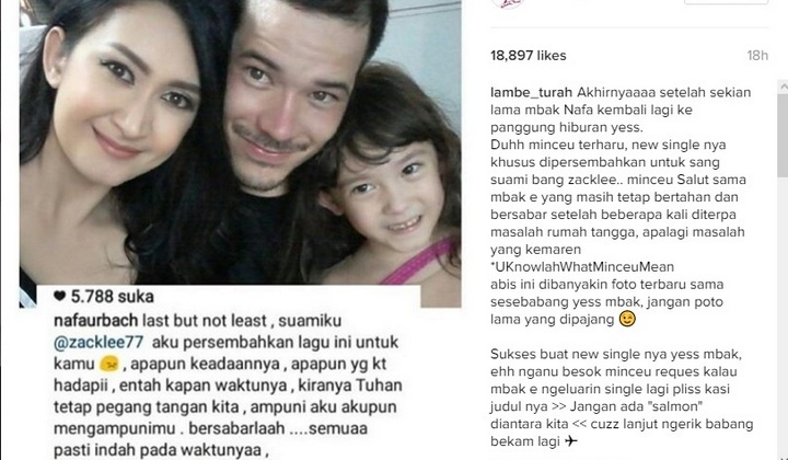"Akhirnyaaaa setelah sekian lama mbak Nafa kembali lagi ke panggung hiburan yess. Duhh minceu terharu, new single nya khusus dipersembahkan untuk sang suami bang zacklee.. minceu Salut sama mbak e yang masih tetap bertahan dan bersabar setelah beberapa kali diterpa masalah rumah tangga, apalagi masalah yang kemaren *UKnowlahWhatMinceuMean. abis ini dibanyakin foto terbaru sama sesebabang yess mbak, jangan poto lama yang dipajang. Sukses buat new single nya yess mbak, ehh nganu besok minceu reques kalau mbak e ngeluarin single lagi pliss kasi judul nya >> Jangan ada "salmon" diantara kita << cuzz lanjut ngerik babang bekam lagi," tulis akun gosip @lambe_turah pada foto tersebut.