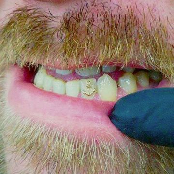 Ternyata tidak cuma para wanita yang tergila-gila dengan berlian gigi. Pria di Amerika Serikat juga mulai berani memasang tooth gem agar makin terlihat manly. Tooth gem yang dipakaipun cukup garang, seperti bentuk jangkar ini.