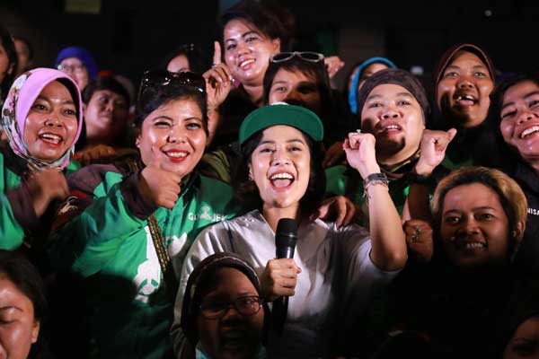 Dian Sastro menyapa para pengemudi GO-JEK wanita di CGV Blitz Grand Indonesia, 11 April. Selain swafoto, Dian juga menyempatkan diri berbincang bersama mereka.