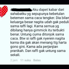 Dalam foto itu, narasumber mengatakan bahwa keluarga Gigi tidak lagi peduli terhadap Raffi Ahmad. "Aku dapat kabar dari sahabatku yang sepupunya kebetulan berteman sama caca tengker. Dia bilang keluarga nagita sudah tidak peduli lagi dengan raffi. Karena semua yang dibilang hanya gimmick itu terbukti benar. Untung Cuma ditonjok sama caca," tulis nara sumber dalam unggahannya, Rabu, 12 April.