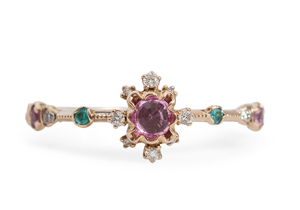 Bukan hanya bunga sakura yang menjadi bunga cantik andalan orang Jepang. Bunga magnolia yang punya ukuran lebih besar juga tak kalah cantik. Buktinya, bentuknya yang manis bisa diaplikasikan pada cincin tunangan yang satu ini.Batu safir berwarna pink membentuk inti bunga, sedangkan kelopaknya dibentuk dari delapan berlian putih kecil.