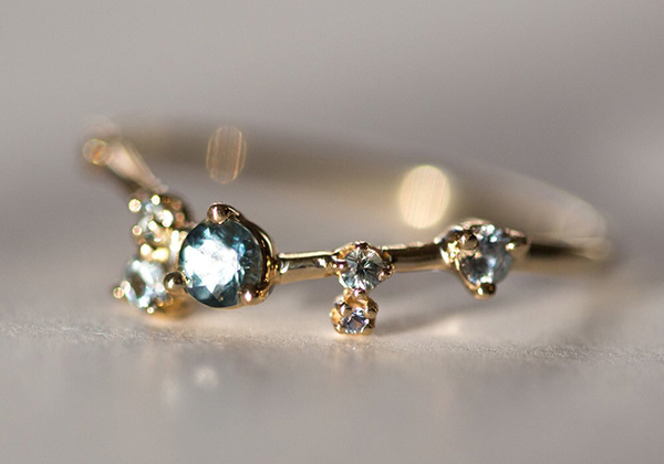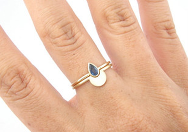 Cincin dengan bentuk tetesan air ini ternyata merupakan cincin two in one. Saat digabungkan, cincin ini akan membentuk tetesan air dengan warna biru dari batu safir dengan bagian bawah berwarna emas matte. Saat dipisahkan, bagian bawah cincin ini membentuk bulan sabit yang tidak kalah cantik.