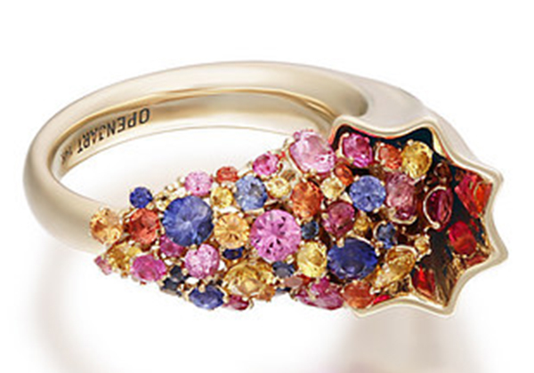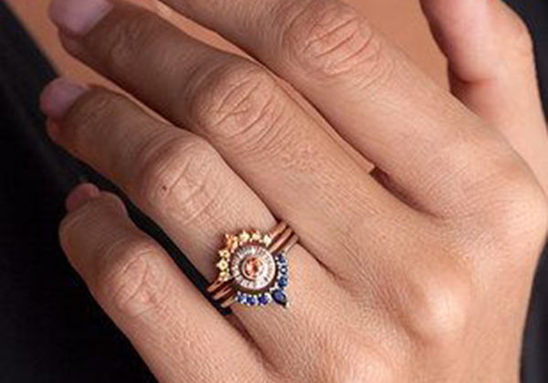Cincin tunangan tidak selamanya harus berbentuk satu cincin saja loh. Ternyata ada juga cincin tunangan yang dijual secara three in one. Bentuknya yang unik seperti matahari ini saat dipisahkan akan membentuk tiga cincin berbeda. Bagian atas dan bawah yang berwarna oranye dan biru akan membentuk setengah kelopak bunga. Dan bagian tengahnya akan membentuk lingkaran dengan berlian berwarna merah.
