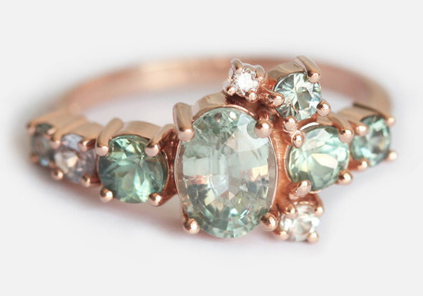 Cukup banyak juga cewek yang suka tampil glamour. Untuknya, paling cocok adalah cincin tunangan dengan hiasan batu safir berwarna hijau ini. Batu safir yang disematkan dengan berbagai ukuran membuat cincin ini makin terlihat mahal. Badan cincinnya pun dilapisi emas 14 karat.