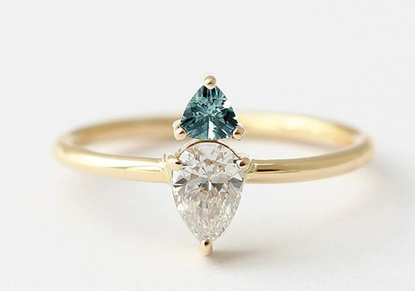 Simpel sekaligus mahal adalah kesan yang didapat saat kamu memakai cincin ini. Cincin yang dilapisi emas 18 karat ini dihiasi dua berlian dengan warna hijau tua dan putih bening. Cincin yang dijual di Etsy ini juga tersedia dengan warna rose.