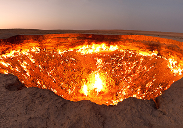 Darvaza gas crater atau yang lebih dikenal dengan gates of hell ini menyajikan pemandangan yang tak biasa. Tapi, juga seram disatu sisi. Lokasi yang awalnya sebuah penambangan gas ini kolabs dan runtuh kebawah tanah pada tahun 1971 lalu. Diameternya mencapai 69 meter dengan kedalaman 30 meter. Didalamnya, masih ada kobaran api yang terus menyala secara abadi. Seakan-akan lubang ini jalan menuju neraka.