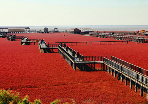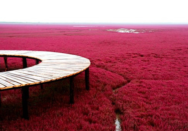Berikutnya adalah Red Beach, Panjin, Tiongkok. Tempat ini membuat kita seakan-akan sedang berada di permukaan planet Mars yang merah. Warna merah ini didapatkan dari rumput laut Sueda yang memang berwarna merah. Tanah basah ini pun berubah warna menjadi crimson.