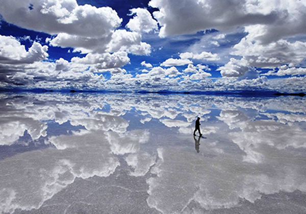 Salar de Uyuni adalah sebuah tanah datar garam raksasa dengan luas mencapai 10.000 meter persegi. Daratan garam yang berada di Bolivia ini terbentuk dari danau-danau prasejarah. Saking tebalnya, daratan garam ini bisa dilalui kendaraan dan wisatawan dapat berdiri dengan aman diatasnya. Saat langit sedang cerah, daratan garam ini berubah menjadi kaca raksasa yang bisa dengan jelas memantulkan bayangan kita.