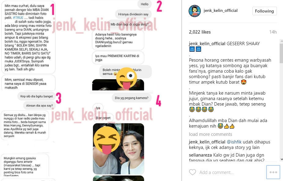 Meskipun sikap sang idola ketus, rupanya narasumber tesebut tetap menjadi penggemarnya. "Mungkin emang gasuka diganggu fans amatir (masyarakat biasaa) ... tapi kami ya tetep seneng, yg penting bisa foto ama Dian Sastro," kata nara sumber dalam pesannya.