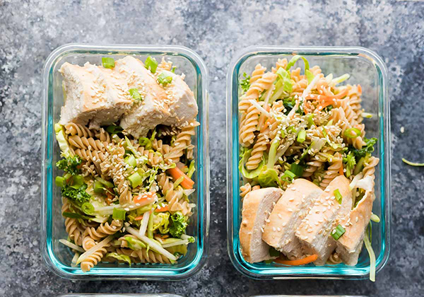 Rebus pasta, boleh spagheti, fettucini atau makaroni. Bumbui dengan garam, merica, atau bubuk cabai agar tidak hambar. Lalu rebus sayur-sayuran yang sudah dipotong panjang dan tipis. Campurkan pasta dan sayuran ini. Sebagai topping, kukus atau panggang dada ayam yang sudah diberi seasoning. Selain sehat, juga mengenyangkan.