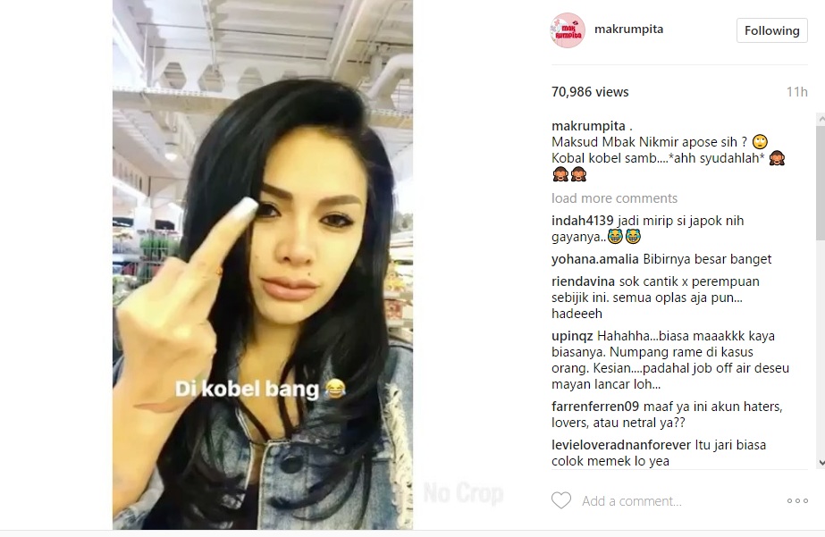 Wanita yang akrab disapa Niki itu terlihat sedang berada di pusat perbelanjaan saat membuat Instagram Story. Sambil mengacungkan jari tengahnya, Niki tidak menampakkan senyumnya di depan kamera. "Di kobel bang," tulisnya di keterangan postingannya.