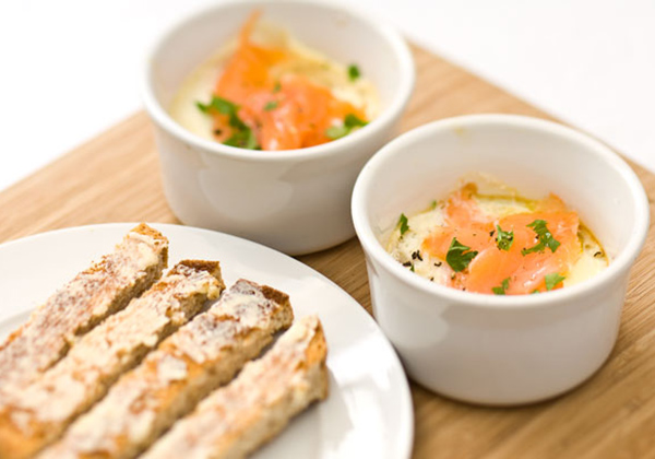 Cara lain untuk makan telur adalah dengan dikukus. Seperti eggs en cocotte ala Perancis ini. Telur dituang kedalam sebuah mangkuk kecil dan ditaburi bumbu. Lalu dikukus hingga matang. Roti bawang atau roti bakar yang dipotong kecil cocok sebagai pendampingnya.