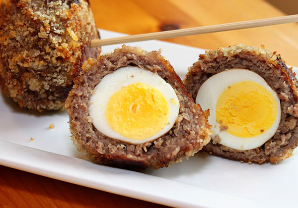 Memang nama makanannya adalah Scotch Egg. Tapi,makanan dengan bahan utama telur ini populer di Inggris, bukan di Skotlandia. Scotch egg terbbuat dari telur rebus yang dibungkus daging sapi. Lalu ditutup lagi dengan tepung roti. Ada dua pilihan memasak, yaitu digoreng atau dipanggang.