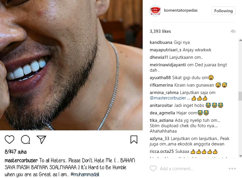 Meskipun tak menampakkan rasa takut, namun kenyataannya Deddy menyampaikan pesan kepada haters untuk tidak membencinya terlebih dahulu. "To all Haters.. Please Don't Hate Me :( .. BAHAN SAYA MASIH BANYAK SOALNYAAAA :) It's Hard to Be Humble when you are as Great as I am.. #muhammadali," tulisnya di caption foto.