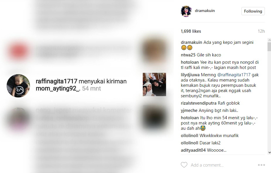 Baru-baru ini, akun gosip @dramakuin mengunggah foto saat Raffi ketahuan menyukai postingan ibunda Ayu di Instagram. Sebelumnya, Raffi juga pernah ketahuan menyukai postingan akun fashion pelantun "Sik Asik" itu.