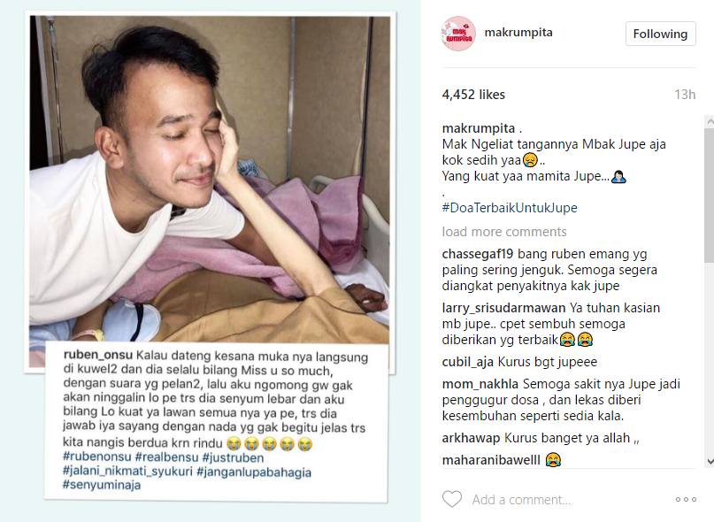 Dalam unggahannya itu, tangan kurus Jupe terlihat memegang pipi Ruben. "Kalau dateng kesana muka nya langsung di kuwel2 dan dia selalu bilang Miss u so much, dengan suara yg pelan2, lalu aku ngomong gw gak akan ninggalin lo pe trs dia senyum lebar dan aku bilang Lo kuat ya lawan semua nya ya pe, trs dia jawab iya sayang dengan nada yg gak begitu jelas trs kita nangis berdua krn rindu," tulis Ruben dalam caption foto yang diunggah ulang oleh akun @makrumpita.
