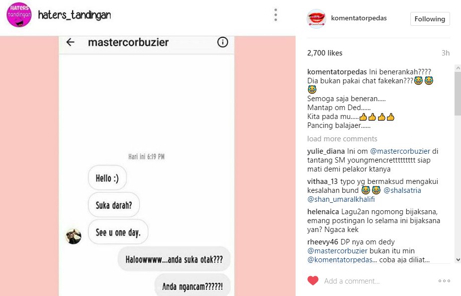 Melalui postingan @haters_tandingan yang diunggah ulang oleh @komentatorpedas, Deddy dan salah satu bala jaer saling adu argumen via direct message atau DM di Instagram. Salah satu anggota bala jaer menantang Deddy untuk mengusutnya setelah ia menuding selebritis itu mengancamnya. "Buktikan kalau emang anda ini pinter ngusut orang," tulisnya di pesan.