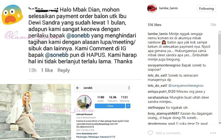 Seorang netizen tiba-tiba meminta Dian menyelesaikan pembayaran atas barang pesanan. Rupanya, kasus tersebut bermula dari manajer Dian, Achmad Musonef yang dituding menghindari tagihan pembayaran itu. "Halo Mbak Dian, mohon selesaikan payment order balon utk Ibu Dewi Sandra yang sudah lewat 1 bulan, adapun kami sangat kecewa dengan perilaku bapak @sonebb yang menghindari tagihan kami dengan alasan lupa/meeting/ sibuk dan lainnya. Kami Comment di IG bapak @sonebb pun di HAPUS. Kami harap hal ini tidak berlanjut terlalu lama. Thanks," komentar netizen di akun Instagram Dian yang diunggah ulang oleh akun @lambe_lamis.