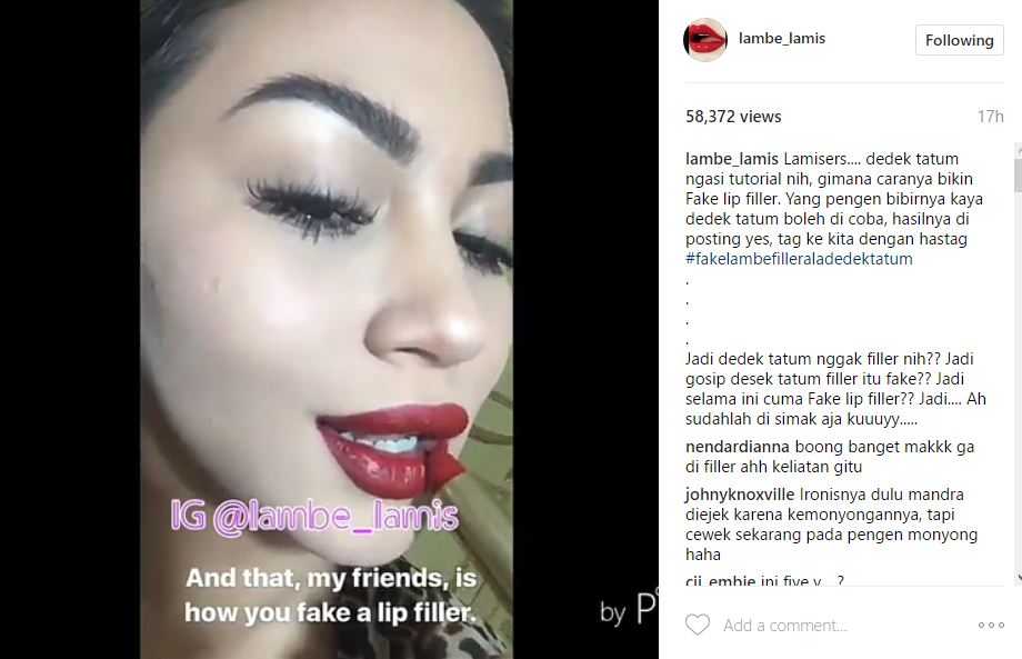 Usai membentuk bibirnya, Ariel memoleskan lipstik dengan warna merah untuk memberi kesan tebal tanpa operasi. "And that, my friends, is how you fake a lip filler," tulis Ariel dalam keterangan video unggahannya.
