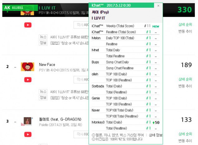 Kanal247.com - Setelah merilis album kedelapannya yang bertajuk "4x2=8", single andalan PSY "I Luv It" sukses menerima gelar all-kill karena berhasil merajai seluruh chart musik di Korea. Tidak hanya "I Luv It", single PSY "New Face" juga menduduki posisi kedua hampir di seluruh chart musik.