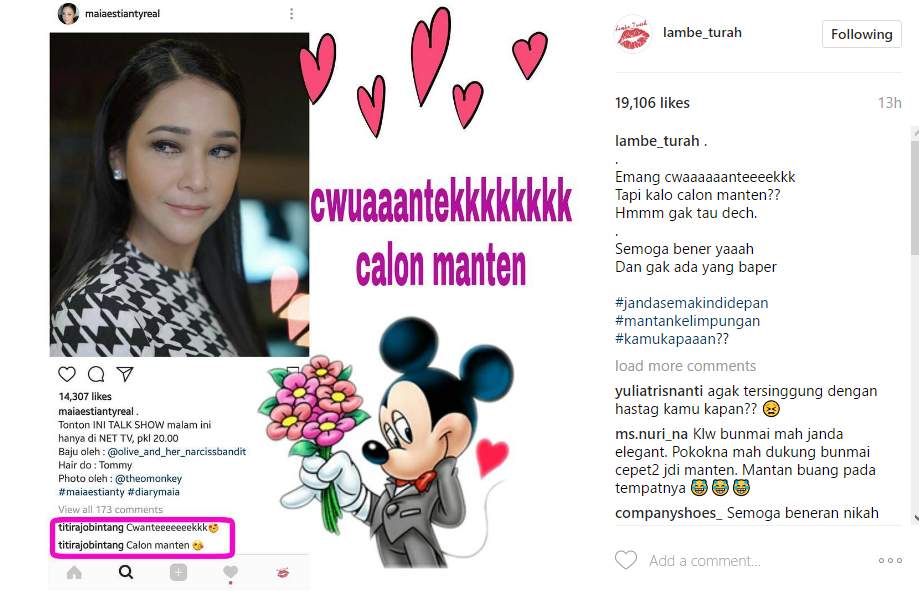 Celetukan Titi itu ditulis saat Maia mengunggah fotonya melalui akun Instagramnya, @maiaestiantyreal. "Cwanteeeeeeekkk," tulis Titi. "Calon manten," imbuhnya.