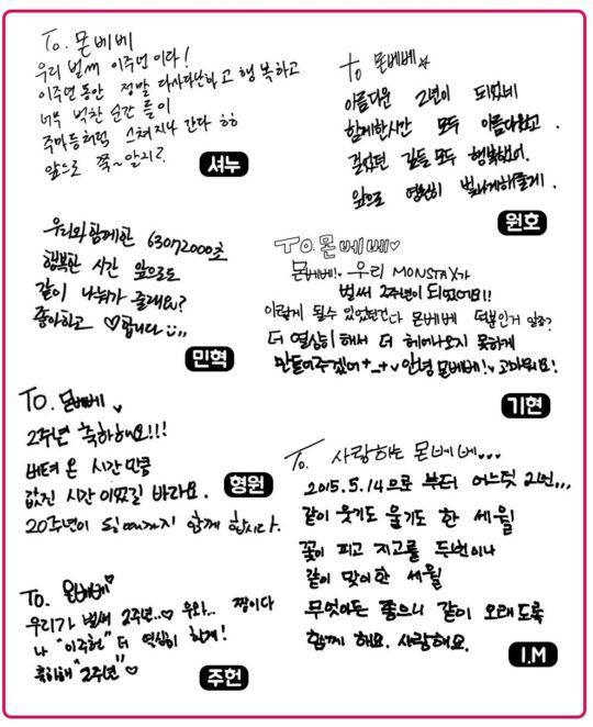 "Untuk Monbebe. Monbebe! Monsta X sudah genap berusia dua tahun! Kau tahu ini semua berkat Monbebe, bukan? Aku akan terus bekerja keras agar kalian tidak meninggalkan kami. Sampai jumpa, Monbebe! Terima kasih!" tulis Kihyun. "Untuk Monbebe. Selamat hari anniversary ke-2! Kuharap waktu yang kita lalui bersama sangatlah berharga untuk kalian. Ayo kita terus berjuang sampai kita mencapai anniversary ke-20!" tulis Hyungwon. "Buat Monbebe. Kita sudah dua tahun bersama... Wow... keren! Aku, 'Lee Jooheon', akan bekerja lebih keras lagi! Selamat hari anniversary ke-2!" tulis Jooheon. "Untuk Monbebe kesayanganku. Dimulai sejak tanggal 14 Mei 2015, dan sekarang sudah dua tahun berlalu. Selama waktu yang kita habiskan untuk tertawa dan menangis bersama, bunga sudah mekar dan dunia telah berputar dua kali. Waktu yang telah kita habiskan bersama, aku menyukai apa pun yang kita lakukan bersama. Jadi, ayo kita terus bersama untuk waktu yang lebih lama. Aku mencintai kalian," tulis I.M.