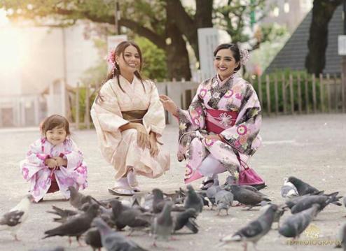 Ashanty, Aurel, dan Arsy nampak kompak mengenakan kimono dengan latar belakang burung merpati yang cantik.
