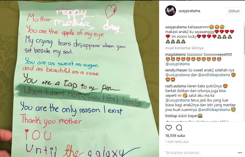 Ussy Sulistyawati justru mendapatkan berbagai ucapan hari ibu dari anak-anaknya. Isi ucapannyapun sukses membuat terharu.