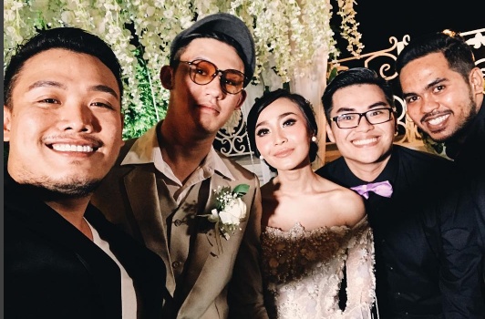 Jevin nampak kasual dengan aksesoris topi di kepalanya, dan Rini cantik dengan off shoulder gown.