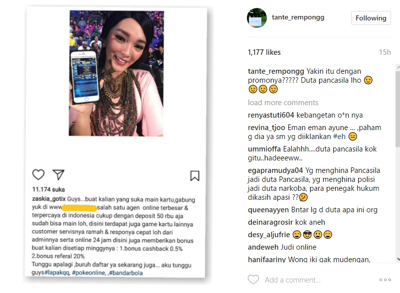Melalui unggahan ulang akun @tante_rempongg, Zaskia mengajak netizen untuk mendaftar dalam permainan kartu tersebut. "Guys...buat kalian yang suka main kartu,gabung yuk di www.*** salah satu agen online terbesar & terpercaya di indonesia cukup dengan deposit 50 rbu aja sudah bisa main loh," tulis Zaskia dalam caption postingannya itu.