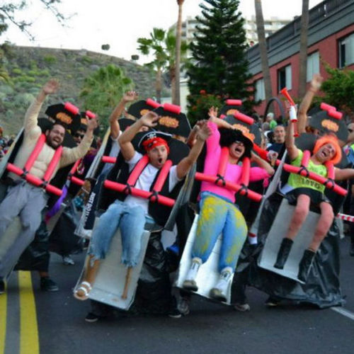 Orang-orang ini tampak seperti benar-benar sedang menaiki roller coaster, padahal itu efek kostum yang mereka pakai.
