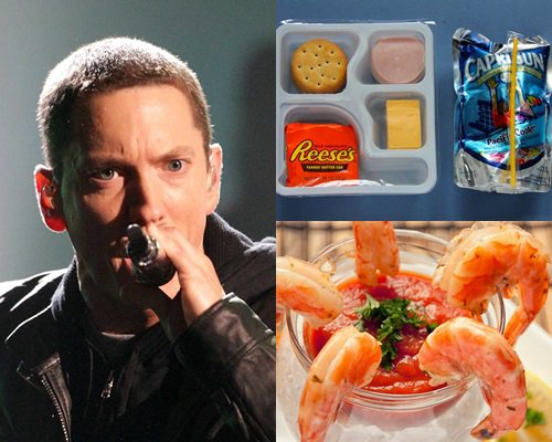 Sebelum manggung, Eminem meminta Diet Coke, Red Bull, shrimp cocktail, serta lunchables yang merupakan menu makan siang anak-anak sekolah di Amerika Serikat pada umumnya.