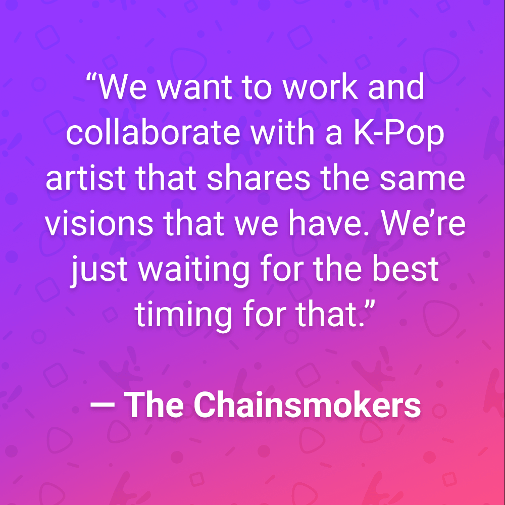 The Chainsmokers merupakan salah satu musisi manca negara yang menyukai K-Pop. Tidak hanya sebatas menyukai musiknya saja, mereka juga berharap bisa berkolaborasi dengan musisi K-Pop.