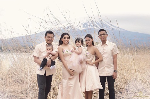 Seragam dengan gaun berwarna pastel, keluarga Hermansyah tersenyum bahagia di depan Gunung Fuji.
