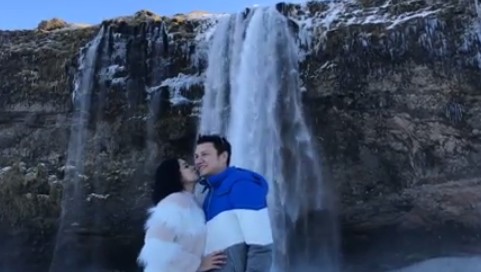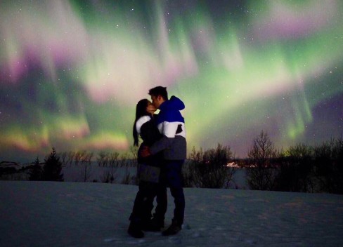 Berlatar belakang cahaya auroroa saat berlibur ke Kirkjubæjarklaustur, Islandia, Tian tak mau kehilangan momen mencium sang istri.
