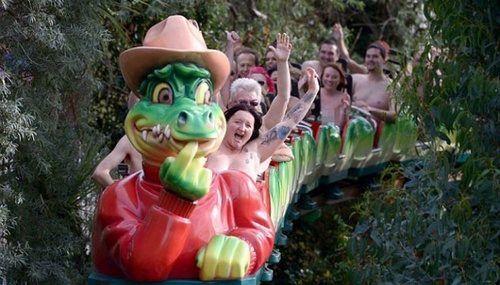 Rekor menaiki roller coaster yang dilakukan 102 orang tanpa busana ini dipecahkan pada 8 Agustus 2010 lalu.