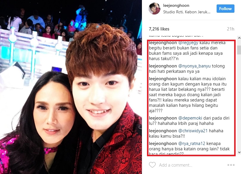 Tak disangka, Lee Jeong Hoon membalas komentar netizen yang menyudutkannya. Lebih dari satu balasan komentar yang Lee Jeong Hoon tulis. "memamg salah pilih idola gmn!?? tolong penjelasannya," balas Lee Jeong Hoon. "kalau mereka begitu berarti bukan fans setia dan bukan fams saya asli jadi kenapa saya harus takut??'n," balasnya lagi.