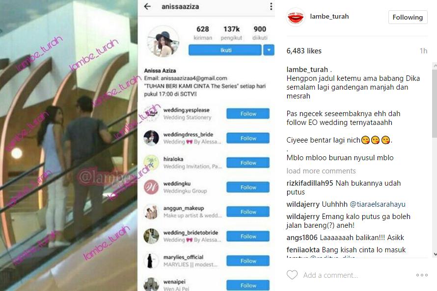 Tak hanya itu, Anissa juga ketahuan mengikuti beberapa akun Event Organizer Wedding. "Pas ngecek seseembaknya ehh dah follow EO wedding ternyataaahh Ciyeee bentar lagi nich," ujar akun @lambe_turah.