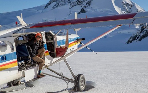 Menaiki helikopter pribadi, mantan Putri Indonesia 2005 ini bersiap untuk menjelajahi gunung es.