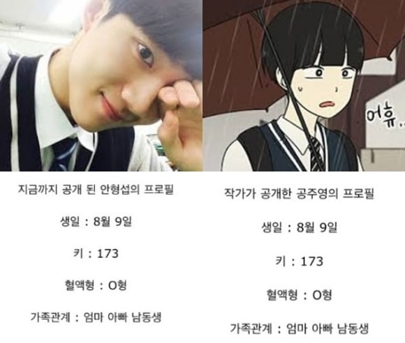 Ahn Hyung Seob sendiri merupakan remaja kelahiran 9 Agustus dengan tinggi badan 173 cm. Dari biodatanya, Hyung Seob diketahui memiliki golongan darah O dan memiliki seorang adik laki-laki. Tidak disangka, semua data ini mirip dengan identitas karakter Gong Ju Young di webtoon tersebut.