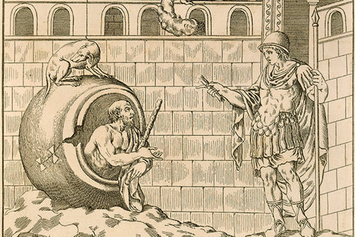 Satu cerita mengatakan bahwa orang-orang mengolok-oloknya di sebuah pesta dengan melempar tulang-belulang seolah-olah dia seekor anjing. Diogenes menanggapi dengan buang air kecil pada tulang itu (sumber: American Heritage Dictionary).