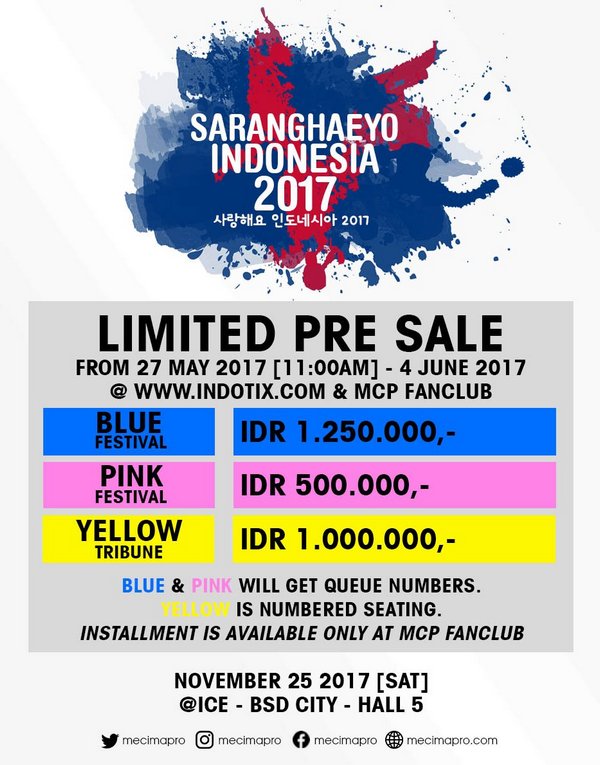 Dalam pengumuman di akun medsosnya, prmotor itu mengumumkan pre-sale untuk konser "Saranghaeyo Indonesia 2017" dibagi dalam tiga kategori. Tiket pre-sale termurah dijual Rp 500 ribu untuk Pink Festival, Rp 1 juta untuk Yellow Tribune, dan Rp 1,250 ribu untuk Blue Festival.