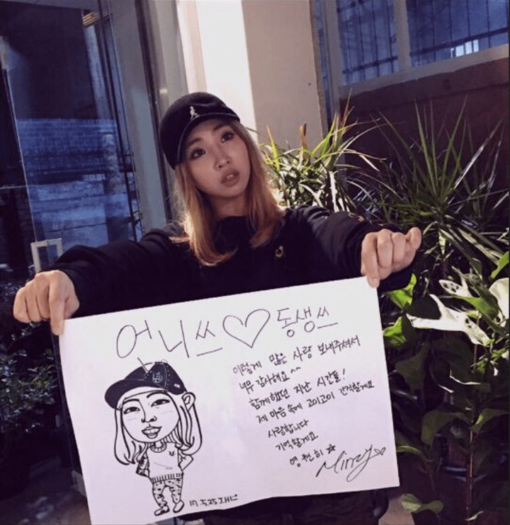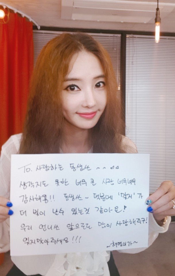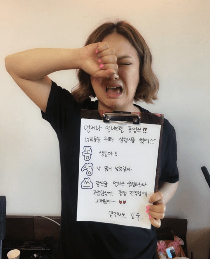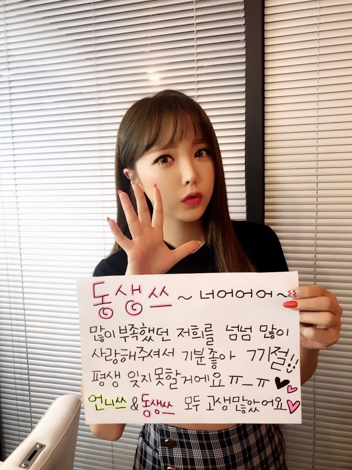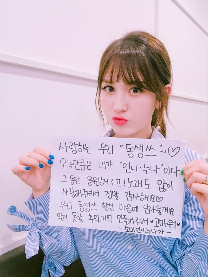 "Dongsaengs, aku sangat senang kalian memberi kami begitu banyak cinta meskipun kami banyak kekurangan! Aku tidak akan pernah melupakanmu. Unnies dan dongsaengs, kalian semua bekerja keras".