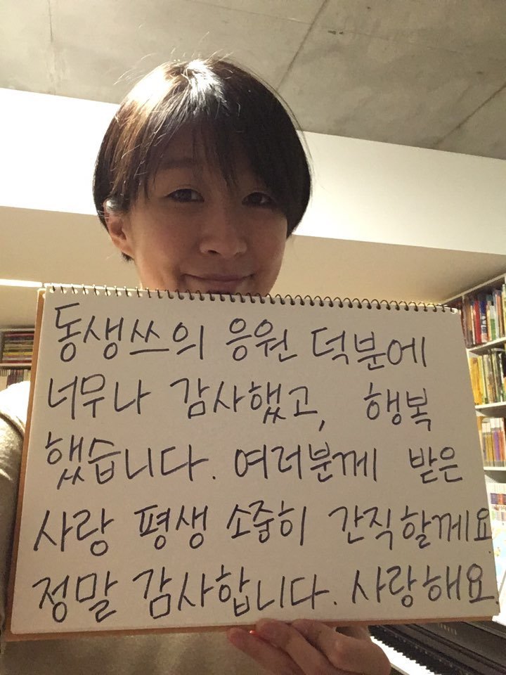"Dongsaengs yang aku cintai. Terima kasih banyak atas dukungannya. Aku akan selalu menjaga Dongsaengs kita di dalam hati. Terima kasih telah membuat banyak kenangan tak terlupakan".