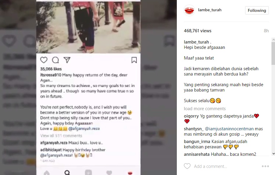 Di sisi lain, Rossa memberi ucapan ulang tahun tak biasa. Melalui akun Instagramnya, ia mengunggah foto masa kecil Afgan sambil mengungkapkan perasaan cintanya. Rossa bahkan mengaku bahwa ia mencintai bagian dari diri Afgan. "You're not perfect,nobody is, and I wish you will become a better version of you in your new age Dont stop being silly cause I love that part of you.. Again, happy bday Agaaaaan Love u," tulis Rossa dalam caption fotonya.