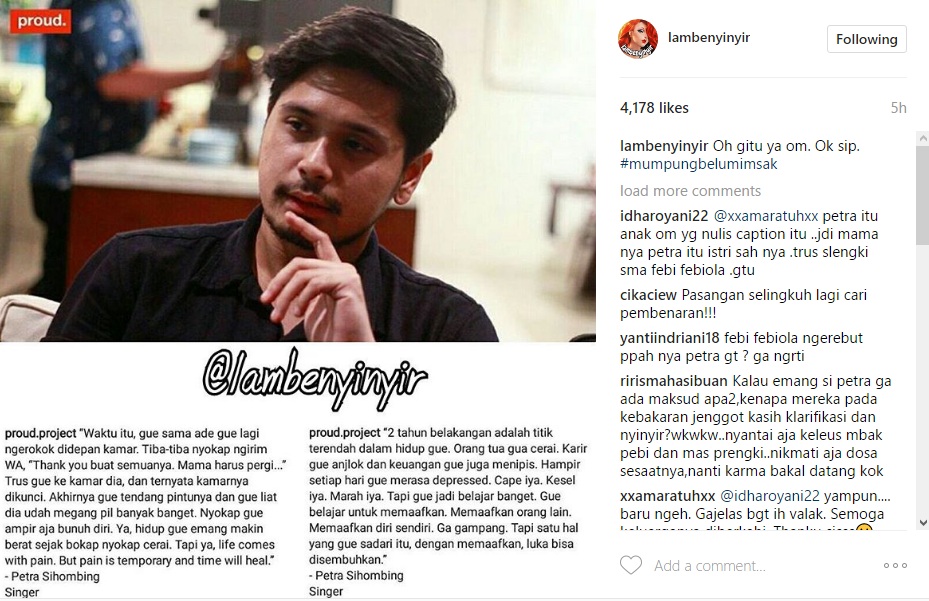 Namun, rupanya curahan hati Petra tersebut justru membuat netizen menyebut Feby Febiola sebagai penyebab kehidupan Petra menjadi berantakan. Seperti diketahui, ayah Petra, Franky Sihombing dikabarkan selingkuh dengan Feby Febiola pada tahun 2015 dan menikah pada awal 2016.