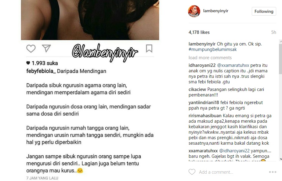 Seolah tak tahan dengan hujatan yang dilayangkan padanya, Feby meminta netizen untuk tidak terlalu mengurusi kehidupan rumah tangganya. "Daripada ngurusin rumah tangga orang lain, mendingan urusin rumah tangga sendiri, mungkin ada hal yg perlu diperbaikin," tulis Feby dalam caption fotonya, Minggu, 28 Mei.