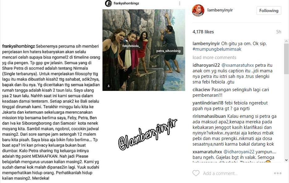 Tak hanya itu, Franky Sihombing juga memberikan klarifikasi soal curahan hati Petra di dunia maya. Rupanya, curahan Petra itu soal single lagu terbarunya yang akan segera dirilis. "Semua yang di Share Petra di socmed adalah tentang Nirmala (Single terbarunya)," tulisnya dalam caption fotonya.