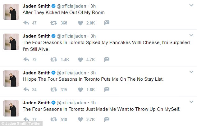 "Hotel Four Season di Toronto membuatku ingin muntah," tulis Jaden pada cuitan pertamanya. "Aku harap Four Season meletakkanku dalam daftar tidak untuk menginap," lanjutnya. "Hotel Four Season di Toronto memberikanku pancake 'berduri' keju, aku terkejut masih hidup," katanya menyindir. "Setelah mereka mengusirku keluar," tutupnya.